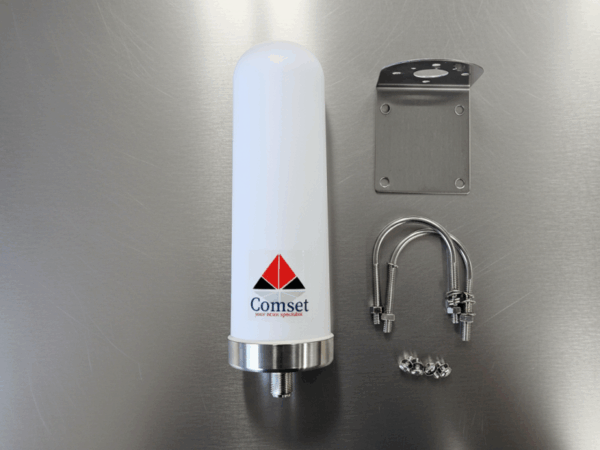 The antenna comes with a stainless steel mount bracket (316) and U bolts. It is fitted with a N-Female connector that can be connected to your choice of coaxial cable. We have a range of 2m, 5m, 10m, 15m and 20m coaxial cables to choose from. The shorter the cable the better, to reduce signal loss.
